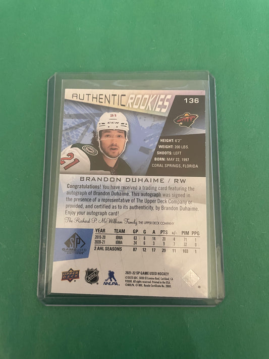 Brandon Duhaime Autographed! Minnesota Wild Authentic Rookies Card