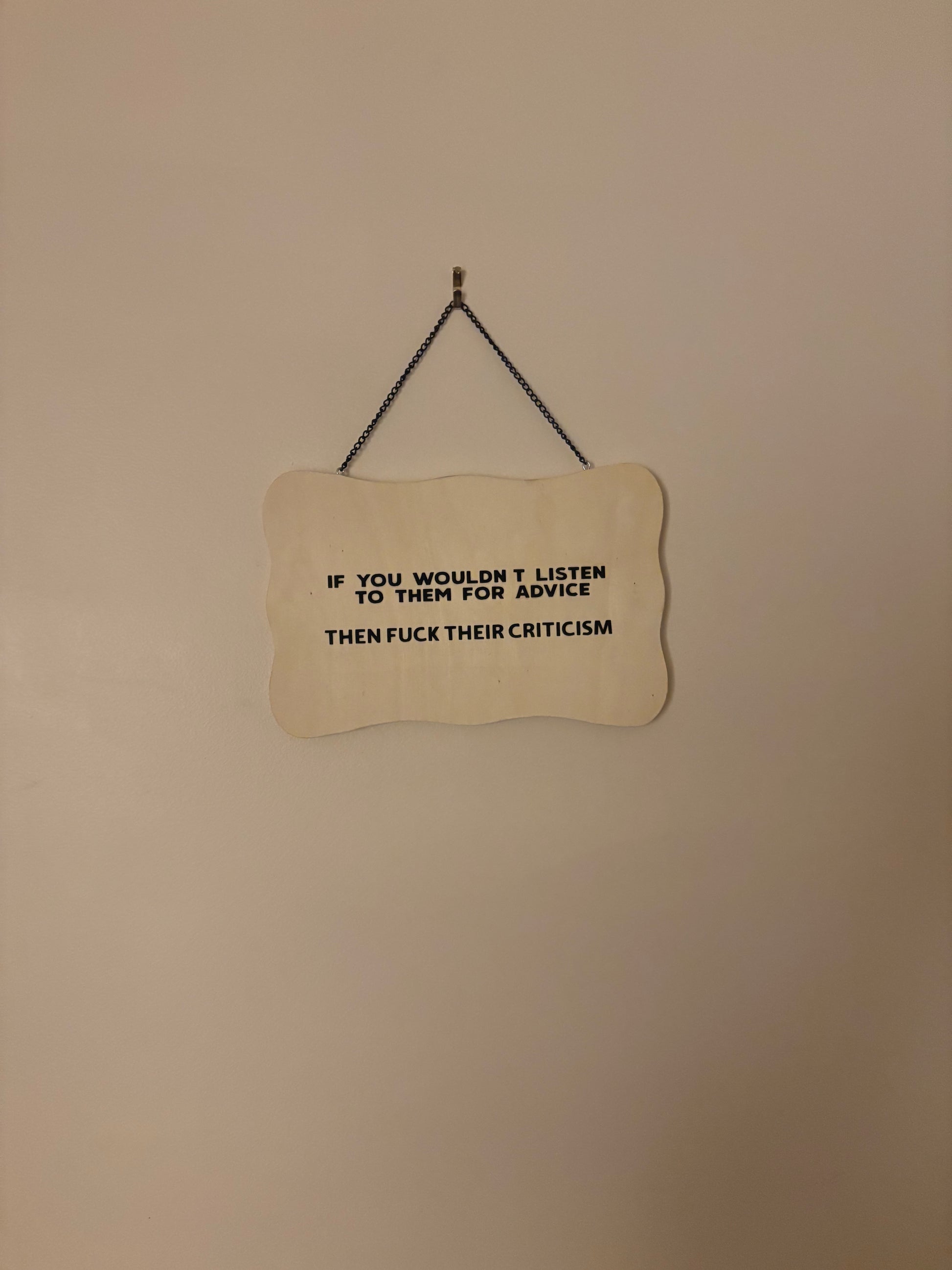 If you wouldn’t listen to them for advice, then fuck their criticism. Wood sign