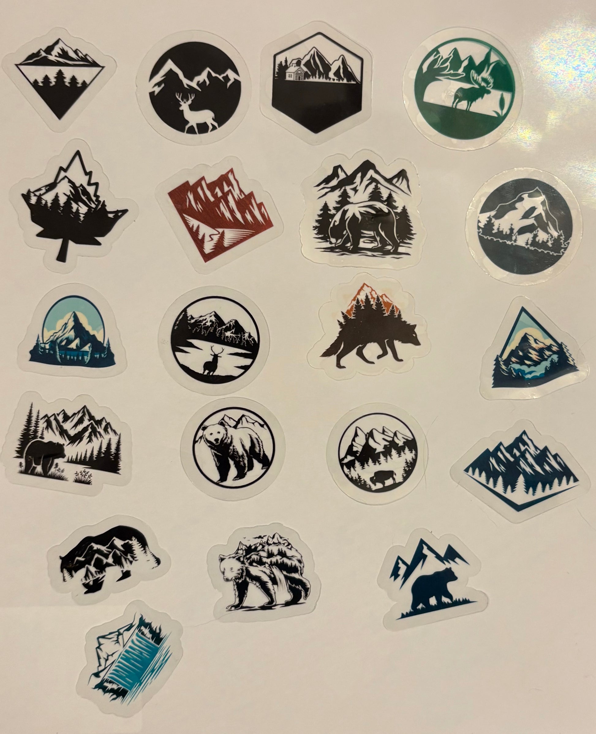 20 assorted mountain themed transparent waterproof stickers.